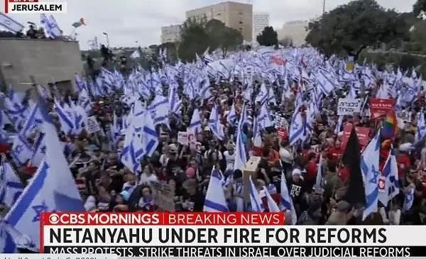 当地时间3月27日晚,为抗议内塔尼亚胡的司法修正案,以色列爆发该国有史以来最大规模的抗议示威活动,63万民众走上多个城市的街头,让以色列几乎陷入瘫痪!