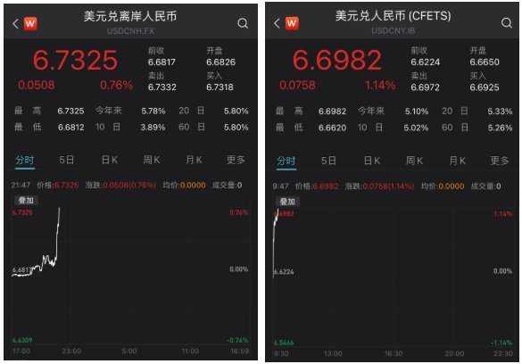 在美联储加息和缩表落地后,人民币对美元延续跌势。5月6日,人民币对美元即期汇率开盘报6.6650,随即跌破6.67、6.68和6.69关口,并逼近6.70关口,较前一交易日下跌一度超过700个基点,再度创下2020年11月以来的新低。今年以来,人民币对美元即期汇率的跌幅一度超过5%。更多反映国际投资者预期的离岸人民币对美元汇率同样走低,5月6日接连跌破6.69、6.70、6.71、6.72和6.73关口,较前一交易日下跌超过500点。今年以来,离岸人民币对美元汇率下跌超过5.7%
