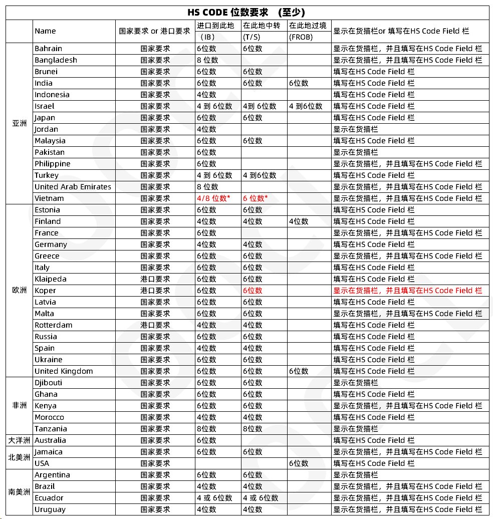 1. 必须提供收货人的公司名、地址、TAX ID、邮箱地址和电话,并显示在提单收货人处;如果是to order 提单, 需提供通知方的公司名、地址、TAX ID、邮箱地址和电话,并显示在提单通知方处;3. 如果提单要求做电放,发货人需告知收货人联系我司目的港办事处从而领取一份正本提单交到目的港海关。近年来,各国进口海关纷纷要求在进口货物的提单信息中显示HS Code。在此我们为您汇总了到目前为止我们所收集到的各国对HS Code的要求如下。温馨提醒,如果是多种货物混装,涉及到不同的HS CODE,请按照HS CODE 分开发送cargo 信息。