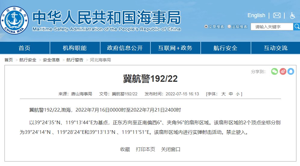 据河北海事局 :渤海,2022年7月16日0000时至2022年7月21日2400时,以39°24′35″N、119°13′44″E为基点,正东方向至正南偏西6°、夹角96°的扇形区域。该扇形区域的2个顶点坐标分别为39°24′14″N 、119°28′24″E和39°13′13″N 、119°11′51″E。该扇形区域内进行实弹射击活动。禁止驶入。
