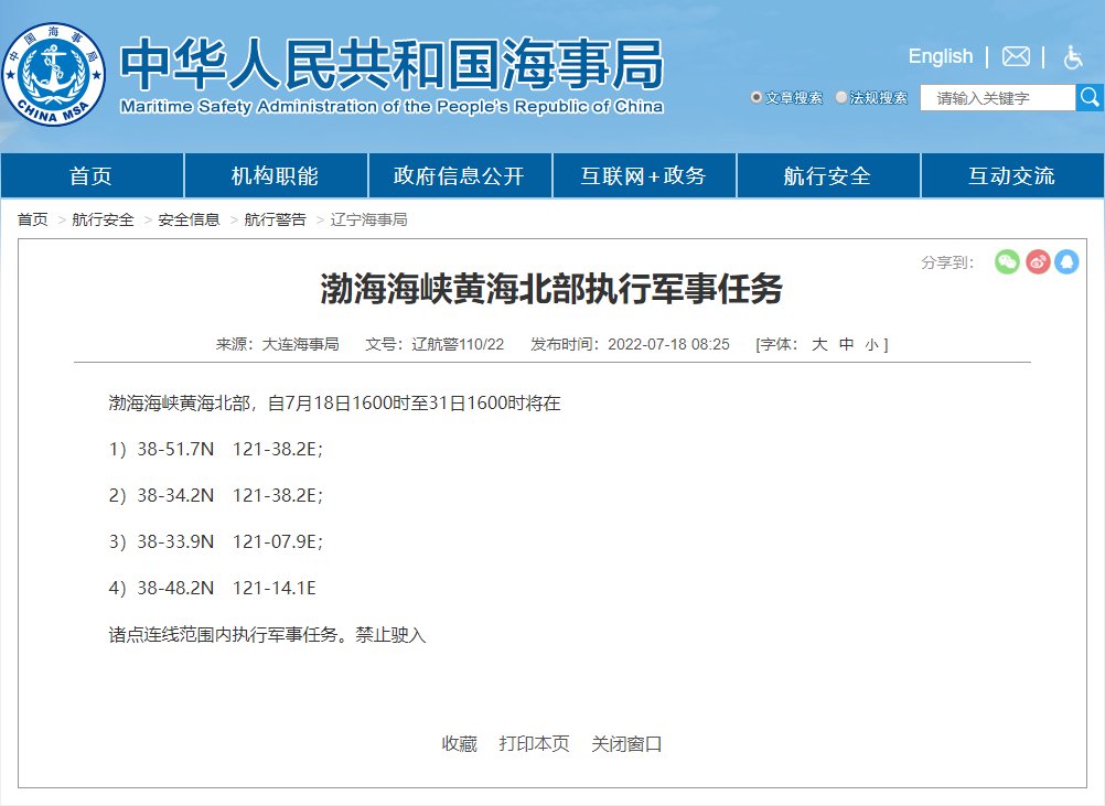 据大连海事局 :渤海海峡黄海北部,自7月18日1600时至31日1600时将在