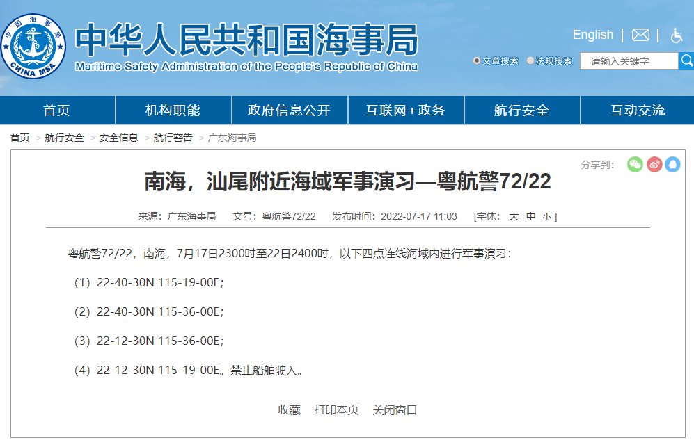 四、粤航警72/22南海,汕尾附近海域军事演习