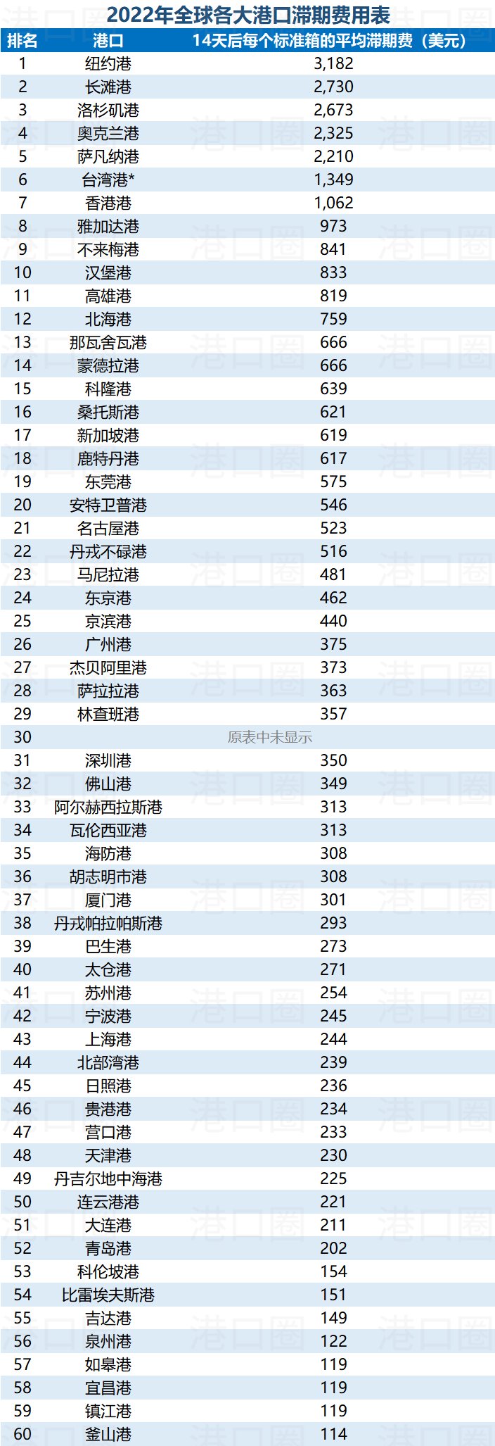 相对于下降的平均费率,2022年,杰贝阿里港、长滩港、洛杉矶港、宁波舟山港、青岛港、上海港、新加坡港、天津港8个港口的滞港/滞箱费都有上升,中国港口占了一半。但千万不要被相对数字迷惑,如果看60大港口的费率排名,就会发现北美与东亚简直天差地别。
