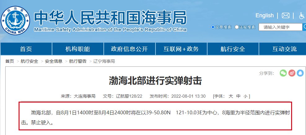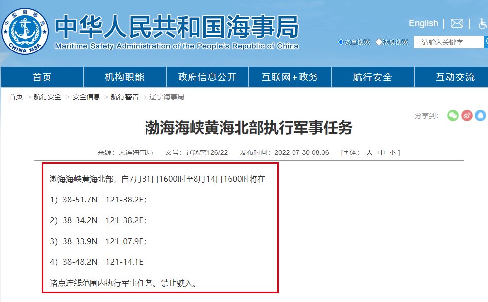 中国海事局网站消息:昨夜今晨,大连海事局、唐山海事局、清澜海事局陆续发布航行警告,宣布南海、渤海等部分海域执行军事任务或实弹演习,航道关闭、商船禁止驶入!
