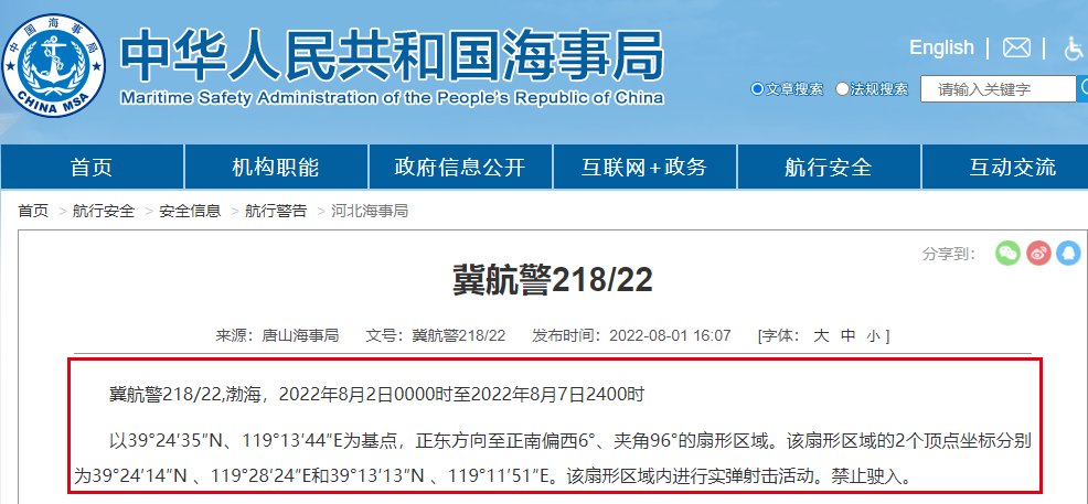 冀航警218/22,渤海,2022年8月2日0000时至2022年8月7日2400时以39°24′35″N、119°13′44″E为基点,正东方向至正南偏西6°、夹角96°的扇形区域。该扇形区域的2个顶点坐标分别为39°24′14″N 、119°28′24″E和39°13′13″N 、119°11′51″E。该扇形区域内进行实弹射击活动,禁止驶入。