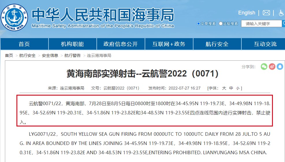 云航警0071/22,黄海南部,7月28日至8月5日每日0800时至1800时在34-45.95N 119-19.73E、34-49.98N 119-18.95E、34-52.69N 119-20.31E、34-51.86N 119-23.82E和34-48.53N 119-23.55E四点连线范围内进行实弹射击,禁止驶入。LYG0071/22,SOUTH YELLOW SEA GUN FIRING FROM 0000UTC TO 1000UTC DAILY FROM 28 JUL.TO 5 AUG. IN AREA BOUNDED BY THE LINES JOINING 34-45.95N 119-19.73E,34-49.98N 119-18.95E,34-52.69N 119-20.31E,34-51.86N 119-23.82E AND 34-48.53N 119-23.55E,ENTERING PROHIBITED. LIANYUNGANG MSA CHINA.