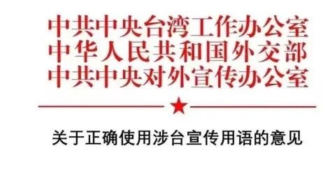 2002年,中央台办、外交部、中央宣办出台了《关于正确使用涉台宣传用语的意见》,文件将容易出现问题的方面,以及正确表述方式进行了详细讲解。2016年3月,中央台办、外交部、中央宣办对《关于正确使用涉台宣传用语的意见》进行了修订,修订中增加了一些新的情况及其正确表述。(修订部分用棕色标出)本文末有正确与不正确的规范举例。