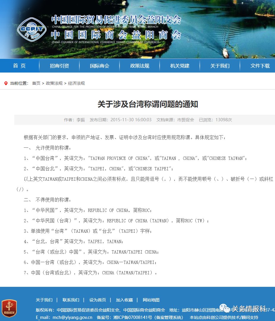 近日,有关部门多次致电我部,认为我会系统出证认证机构所办理的部分认证文件,如产地证、发票、证明中涉及台湾称谓方面有不妥之处。外交部领事司要求各部门要统一做法。现将有关规定提供如下,请各地方贸促分支机构在具体出证认证工作中严格遵照执行。根据有关部门的要求,申领的产地证、发票、证明中涉及台湾时应使用规范称谓。具体规定如下:一、 允许使用的称谓: