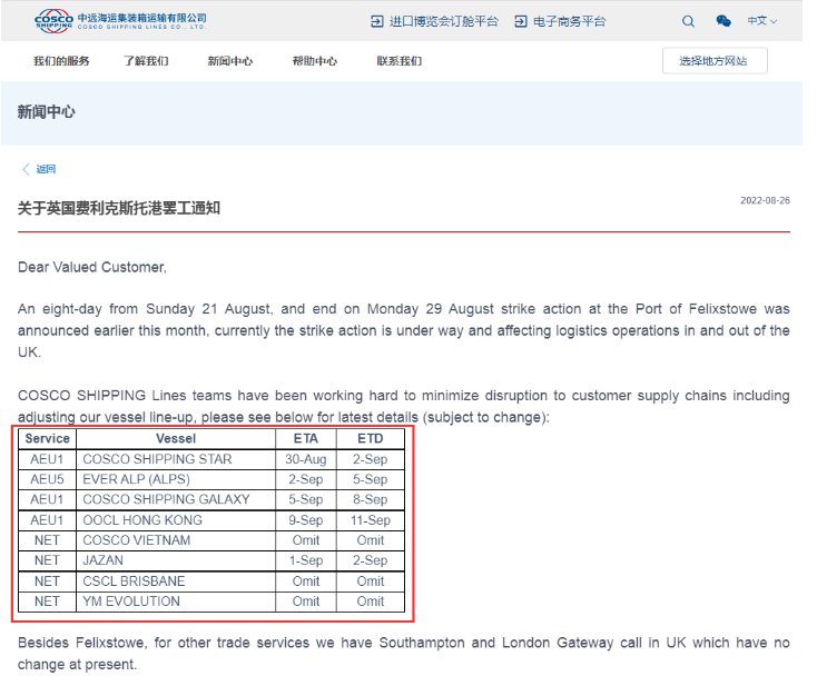 中远海运集运发布关于英国费利克斯托港罢工通知,表示团队一直在努力减少对客户供应链的干扰,包括调整船舶船期,请参阅下文了解最新详情(可能会发生变化):