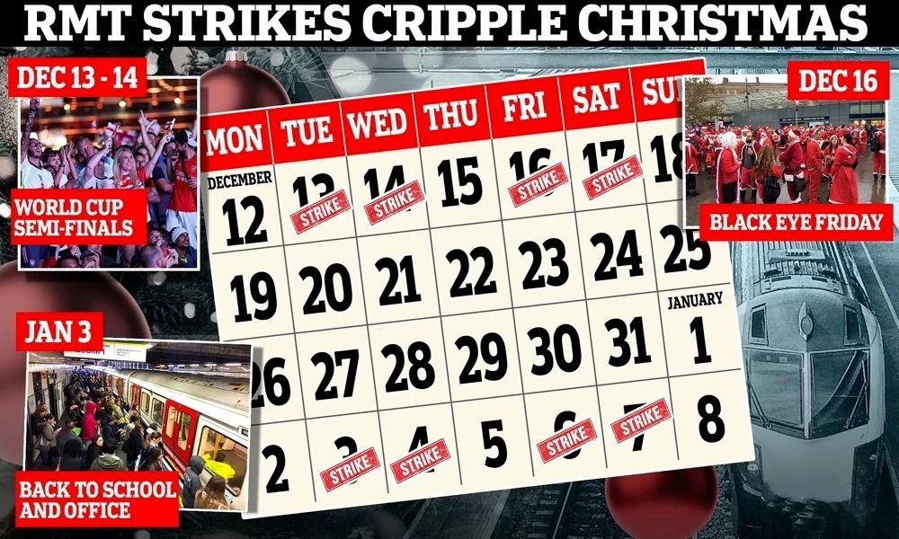 据英国广播公司(BBC)报道,英国的通胀率达到11%,民众生活成本大涨,导致几个月来多个行业频繁举行罢工。英国铁路、海事和运输工人全国联盟(RMT)工会周一(12月5日)晚间宣布,预计Network Rail和火车公司的约4万名铁路工人计划从圣诞节平安夜(12月24日)下午6点起开始进行4天大罢工直至27日,以争取改善薪酬及待遇。届时,罢工前后的日子将会出现交通中断。RMT称,这是对已经宣布并于下周开始的铁路工人罢工的补充。此前,运输业员工协会(TSSA)12月2日宣布,铁路工人将举行四个48小时的罢工行动,分别是:12月13-14日、12月16-17日、明年1月3-4日和1月6-7日。这次大罢工被形容为30多年来最具破坏性的铁路工潮。