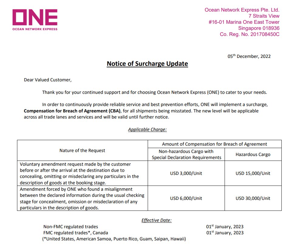 近日,船公司ONE发布公告称,为了提供可靠、安全的运输服务,ONE将对所有瞒报、漏报或错报的货物征收附加费用,违约赔偿(CBA),新标准将适用于所有贸易通道和航线,生效时间为2023年1月1日,直至另行通知。